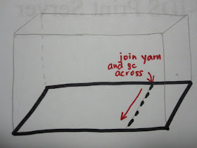 Turn insert inside out. Join yarn at starting point (Diagram 4) of where your divider will be. {Insert hook in and out, yo and pull up a lp} --> this is PU, {yo and pull through 2 lps} -->; this is sc. Here's a badly made PU & sc video ;) Insert hook in place where you just made your sc, and out on the next st, yo and pull up a lp, and sc. Cont. to PU and sc to outline the base of your divider. Keep count of how many sc made. Keep this number of stitches as you work up your divider with hdc. The number of hdc should be the same as your outlined sc.