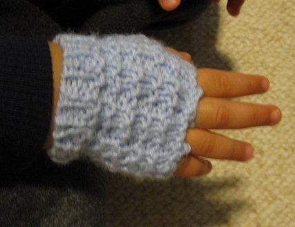 This is knitted in rectangle, with increase around the thumb. Then BO for the thumb opening. The finished piece is then seam together. To hold the hand warmer form slipping down when worn, I crochet chains and attached it using surface crocheting.